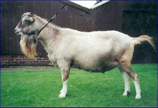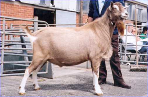 Rowen was the most successful herd sire of recent years, producing a string of high yielding, prize-winning milkers with superb udders. He was the son of CH. Rowena, who was a Royal Show Best in Show winner, and won her Championship and Breed Championship as a first kidder when giving 7½ kilos of milk . As a second kidder she yielded in excess of 8½ kilos under show conditions but was never officially milk recorded. In the Charnocks herd Rowen sired, amongst others, R182 Bronwen BrCh, RM215 Catrin BrCh, RM222 Blythe BrCh and RM158 Brazen who together with their daughters and grand-daughters now form the entire herd. Used for one season only in the Woldsway herd he sired RM207 Crisiant (4.57%fat,2.59% protein) and RM196 Creuddylad (4.32% fat,2.95%protein) - these two Woldsway goats can be seen on the British Toggenburg Society website in the photo gallery (page 4). He won the prestigious Wright Challenge Bowl awarded to the male who has sired the greatest number of daughters giving over 5 kilos of milk, with fats over 3.5%, in recognised milking competitions.
